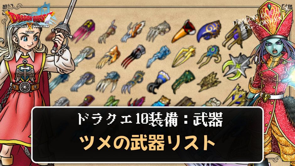 ドラクエ10オンライン(DQ10)の武器「ツメ」のシリーズのパラメータ数値と追加効果などを一覧として掲載しています。数値はできのよさ星3未錬金です。検索から装備名などを入力すると絞り込み表示されます。