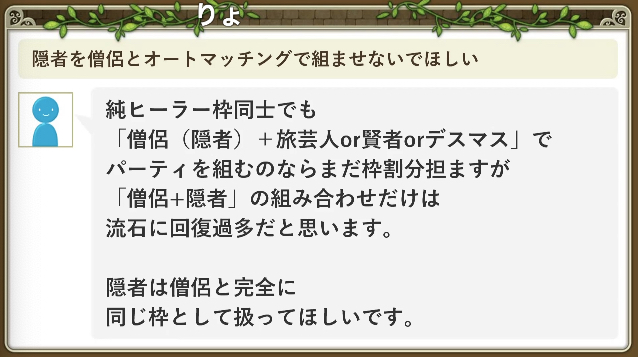 バージョン7.5になってから一番いただいた提案。結論から言うと、回復枠で先に僧侶いるから隠者がマッチングできない…ってことは避けたい。アタッカー4人いるからバトマスが入れない…とか理想としてはいろんな職業で遊んでほしい。回復職がいない…ってことはない仕様にしてる。そもそも隠者をヒーラー枠にするとマッチングに時間がかかる問題もある。今は隠者をみんな育成してるので遊ぶ機会が多いだけ。様子を見て今後検討