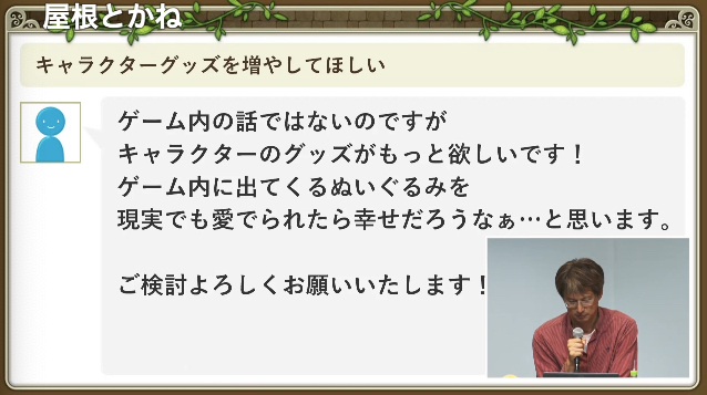 個人的にもグッズほしい。(DQXのキャラやモンスターは)人気だって数字も見ている。実は色んなところでグッズを出そうって企画は常にしている。今は言えないがお楽しみに。