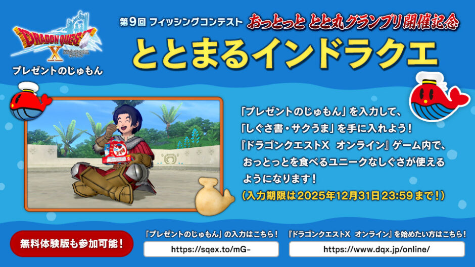 「とと丸」をゲーム内で釣り上げて、「とと丸の帽子」をゲットしてね!さらに「プレゼントのじゅもん」を入力すると・・・