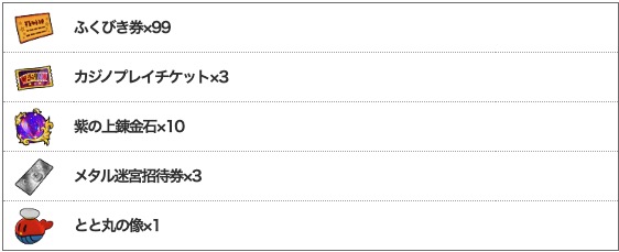 「ふくびき券×99」「カジノプレイチケット×3」「紫の上錬金石×10」「メタル迷宮招待券×3」「とと丸の像×1」がもらえます!(全キャラもらえるよ)