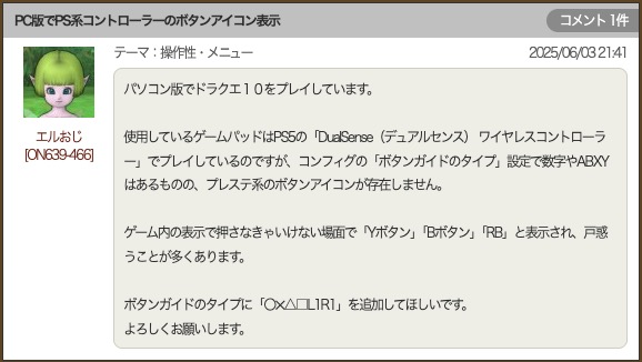 提案したのはアプデ前の6月。今回のバージョン7.6でも未搭載ってことを考えると運営的には消極的でおそらく、〇×△◻︎表記はプレステの®️だからPS版以外でその表記は使っちゃダメなのかなぁ…と予想してる。