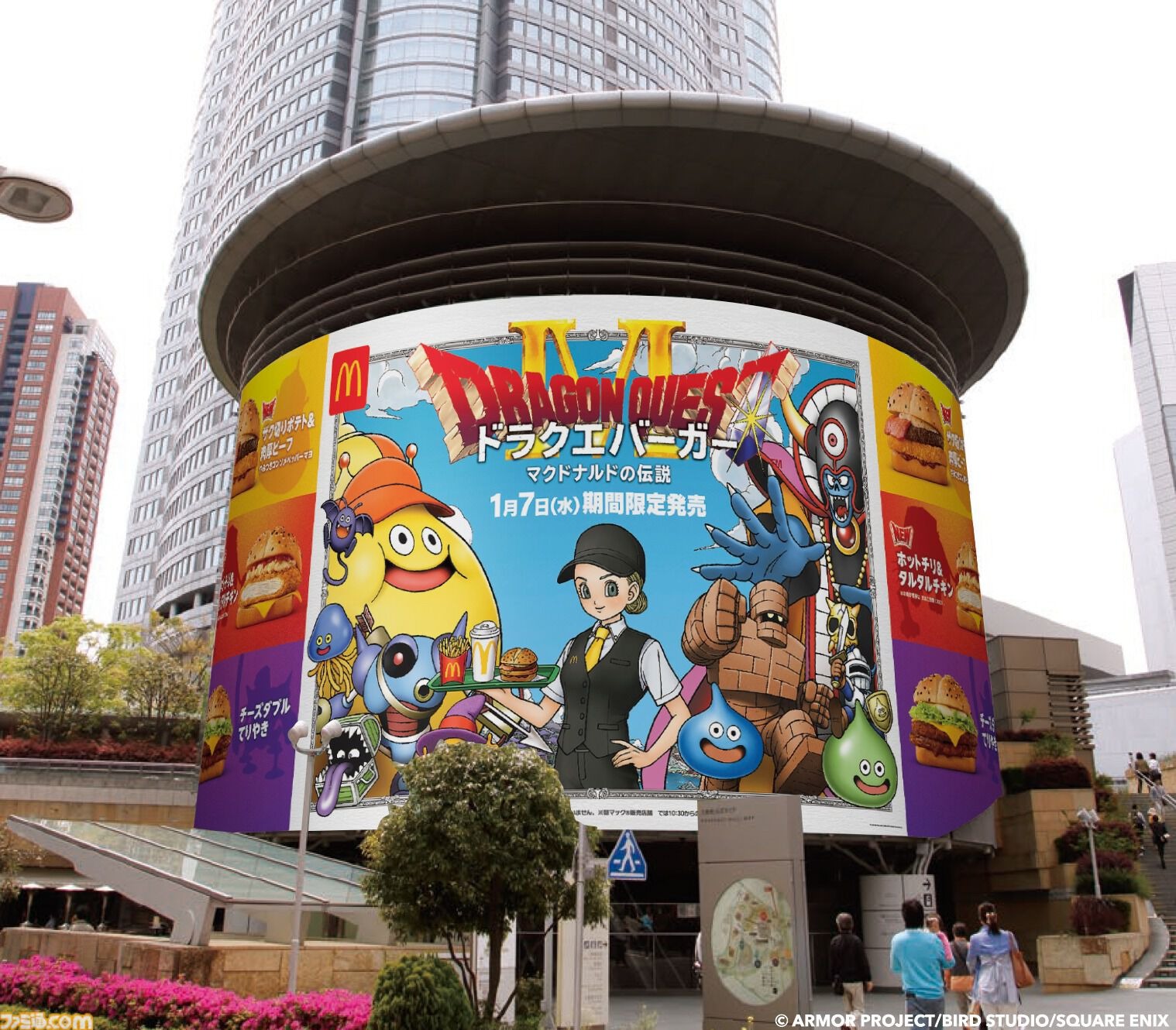 マクドナルドとドラゴンクエストのコラボレーションを記念して、『ドラゴンクエスト』の世界観たっぷりのユニークな限定屋外広告が出現! 1月6日(火)から、巨大なドラクエバーガーのヴィジュアルを掲載した屋外広告が六本木ヒルズにて期間限定で登場します。 ドラクエバーガーの誕生を伝えるドラクエモンスターたちと、ドラクエバーガー3商品の迫力満点な屋外広告にぜひご期待ください。