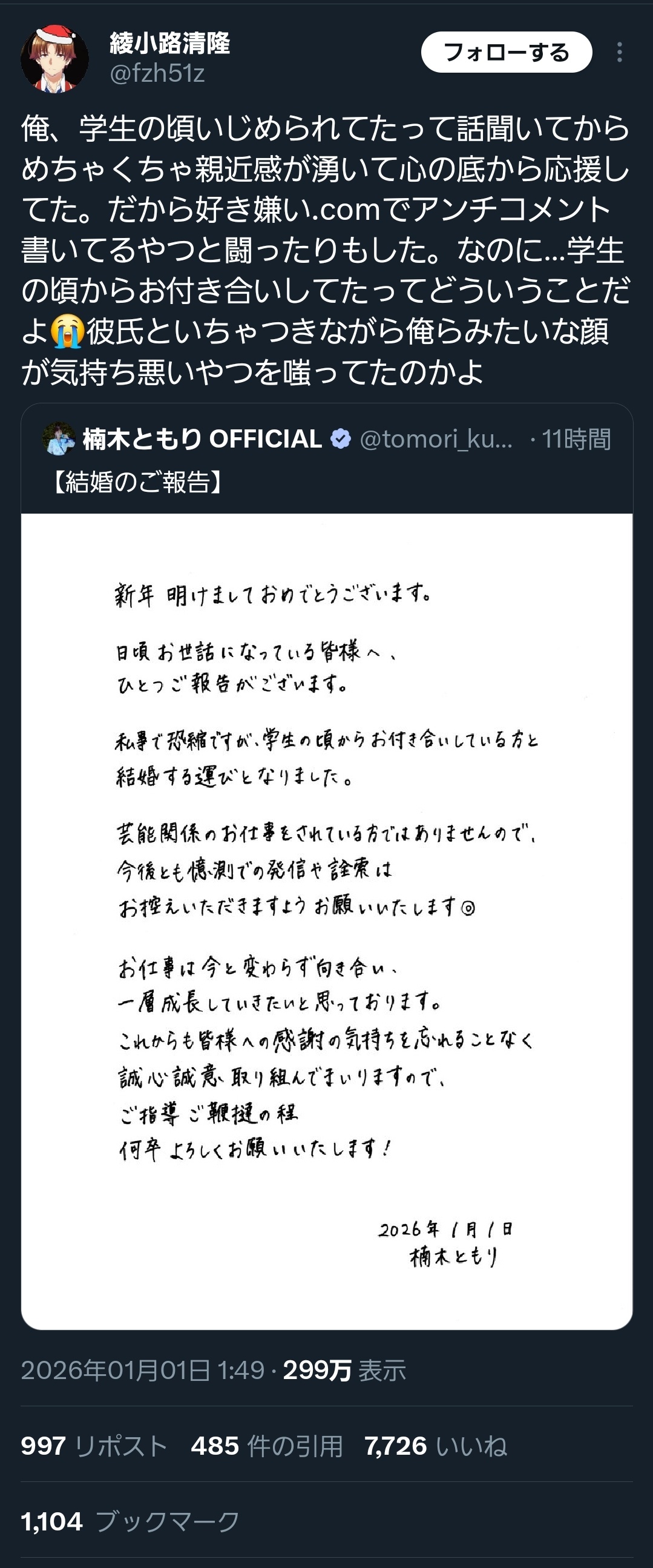 — 楠木ともり OFFICIAL (@tomori_kusunoki) December 31, 2025