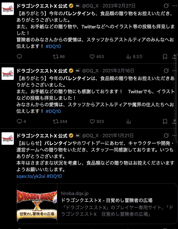 バレンタイン/ホワイトデーなどに、キャラクターや開発・運営チーム宛に贈り物をしても良いかとのお問い合わせをいただいたため、情報を掲載しました。https://t.co/b8Qq4OQSOn #DQ10— ドラゴンクエストX 公式 (@DQ_X) January 16, 2026