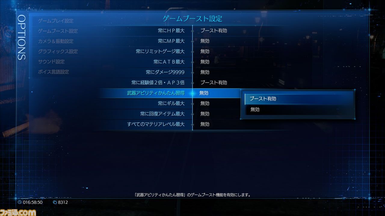 ゲームブースト機能はつねにHPやMP、リミットゲージ、ATBが最大にできたり、さらにつねにダメージ9999、すべてのマテリアレベルを最大することが可能という、もはやチートレベルのブーストが可能になっている。このゲームブースト機能をすべて有効にすれば、ハードモードですらストーリーの各バトルをサクサク終わらせることができるのだ。