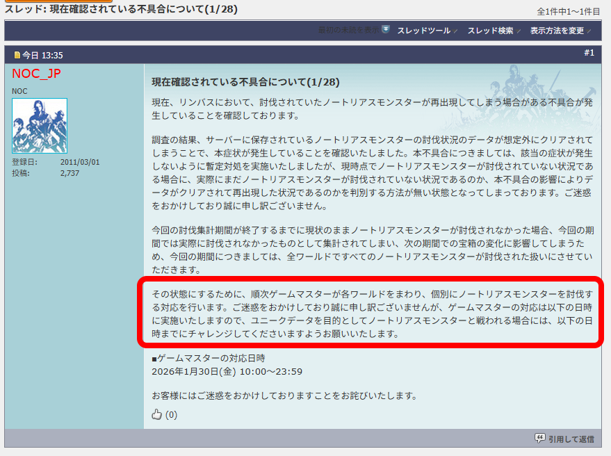というのも今回の対応では「すべてのNMを討伐された」状態にするため、ゲームマスター(GM)、つまりサポートスタッフが各ワールドを回り、順次NMを討伐していくと伝えられている。対応日時としては、1月30日の10時から23時59分までの予定だ。この異例の人力対応について、注目が寄せられているかたちだ。