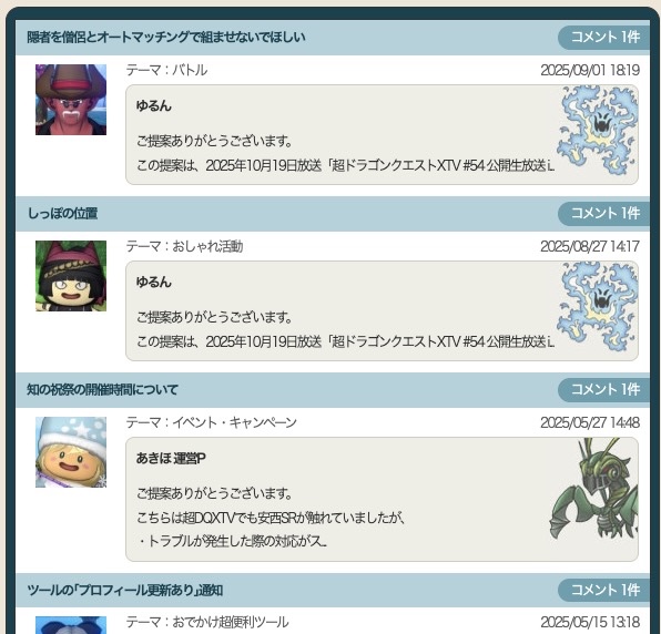 提案広場に想いをぶつけてみてもスタッフからのお返事は去年の秋で止まっているし、最近でもDQXTV内で「提案広場に生アンサー」もあまりやらなくなってきたし、「はたしてユーザーの声は届いているのだろうか…?」と疑心暗鬼になってついついネット上で熱くなり“強めの言葉”をゲームではなく人に、議論ではなく暴言をぶつけてしまう人も少なくない気がします。