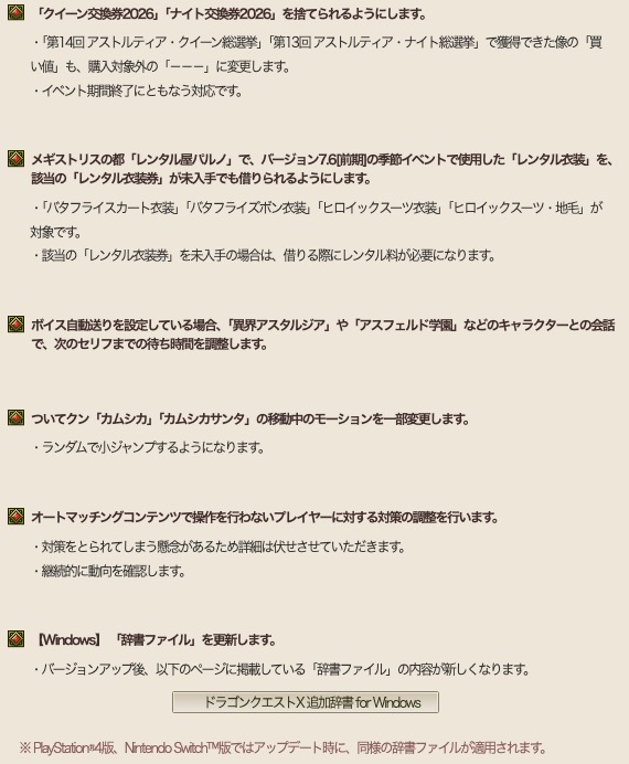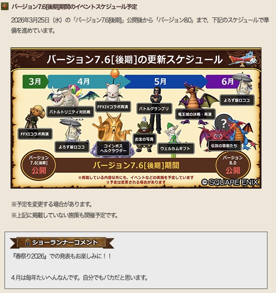 冒険者の広場で「大型アップデート情報 バージョン7.6[後期]」の情報記事が公開されました。先日放送されたDQXTV「超ドラゴンクエストXTV #57 バージョン7.6[後期]最新情報」では語られなかった情報や補足だけをピックアップしてみました。