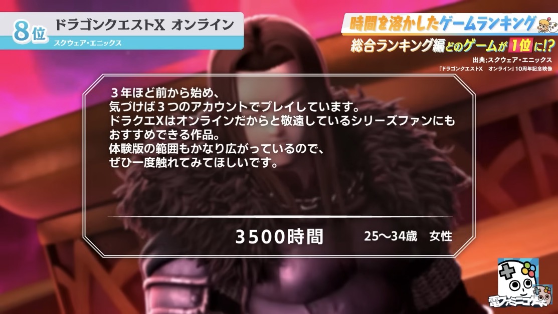 「3000時間くらい。当時出会った仲間とはいまだに交流があります。自分にとって人生を楽しいものに変えてくれた神ゲーです。」(25~34歳 男性) pic.twitter.com/wdaMcmV35p